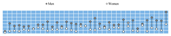 Presently, the average male life expectancy at birth is shorter than that of females [1]. This phenomenon is caused by the excess of male deaths over female deaths. Life expectancy of females reached disproportionate levels with respect to that of males at the beginning of the 20th century; however, at that time, in most countries, women were expected to live on average for only about two years longer than men [2]. Over the following decades, the disparities in life expectancy between men and women increased, especially after the Second World War [3]. According to global data available for the years 1950–2017, life expectancy for men aged 0 increased from 48.1 to 70.5 years, whereas life expectancy for women increased from 52.9 to 75.6 years [4]. In 2017, the difference in life expectancy between men and women worldwide was 5.1 years due to the disadvantage of men. The growth in male excess mortality was largely due to chronic diseases associated with increased male exposure to risk factors such as nicotinism, alcohol consumption and unhealthy eating habits [5]. One of the main causes of the excess mortality of males was malignant types of cancer, primarily lung cancer, which remains the main cause of male cancer deaths in 93 countries [6]. Epidemiological analyses published in recent years show that at the turn of the 20th and 21st centuries, a reduction in the gender gap in life expectancy was observed [4]. In 2017, the world’s most comprehensive observational epidemiological study to date, “Global Burden of Disease”, published an analysis of the mortality of men and women worldwide over a period of 67 years between 1950 and 2017. The results of this study indicate that the decline in male excess mortality in the best developed countries has been taking place since the 1990s [4]. Moreover, international health care institutions report that there has been a decrease in the exposure of men and women to risk factors associated with the development of the gender gap in mortality rates over recent decades [7,8]. There has also been a decline in mortality caused by cancer [9] (which has been the reason for higher mortality rate in the male population for many years).