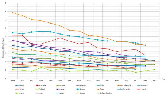 A non-European country with the fastest rate of decline in excess mortality of males was New Zealand. Despite the small scale of male excess mortality due to lung cancer (in 2014 it amounted to 1.2), the scale of this phenomenon decreased by 22% between 2002 and 2014.