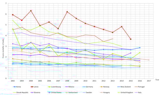 The data gathered in the countries belonging to the Organization for Economic Cooperation and Development (OECD) show that the habit of smoking in both sexes has been decreasing, but this reduction occurred earlier in the male population and has thus reached a greater extent [8,9]. There has been a reduction in the exposure of men to harmful substances in the workplace, causing their mortality to be ten times higher than that of women. There has also been a marked reduction in the mortality of men due to cardiovascular diseases and cancer [9,10,11,12,13]. The aim of the study was to analyze changes in the level of excess mortality of men due to lung cancer between 2002 and 2017 in the countries of the OECD. We considered this topic to be important because the excess mortality of men concerning most diseases and deaths from external causes. However, despite the importance of the problem, the number of papers dealing with the subject seems to be inadequate. In view of increasing significance of cancers related deaths, the topic of excessive mortality of males due to lung cancer, the most common cause of death among cancer patients, is of great importance. This is especially so since previous reports on changes in lung cancer mortality in developed countries suggest changes in the socially and economically unfavorable phenomenon of excess mortality of males [14,15].