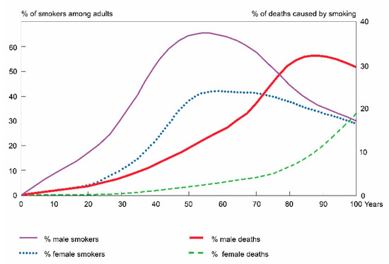 In the female population, the peak in the popularity of smoking took place later. In some countries, i.e., the United States, Canada, Australia, the United Kingdom, Denmark and Sweden, the highest prevalence of smoking took place in the 1980s and then decreased [7,25]. Nevertheless, a reduction in male mortality rates was observed in these countries. Despite a decrease in women’s tobacco consumption, the mortality caused by malignant pulmonary cancers dropped more slowly than in men or even increased.