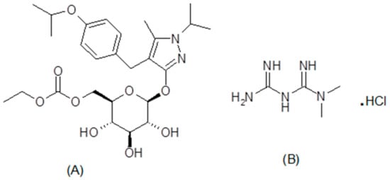 Common endocrinological diseases, like Diabetes Mellitus Type 2 (DMT2), are already enormous and growing at alarming percentile throughout the world. As estimated, the number of diabetic patients will increase to more than 500 million by the year 2030 and to more than 700 million by 2045 [1,2]. Numerous studies have been undertaken to elucidate more efficacious antidiabetic drugs with improved glycemic control, with fewer adverse effects [3]. Sodium-glucose cotransporter-2 inhibitors (SGLT-2) were recently approved for the management of DMT2, [4,5] alone or in combination with other antidiabetic drugs. Remogliflozin etabonate (REM, Figure 1A) is a recent addition to the SGLT-2 class of antidiabetics [6,7] having better glycemic control along with added advantages such as insulin-independent action, reduction in body weight, controlling blood pressure, and its protective effect on the cardiovascular and renal system. REM acts by inhibiting the SGLT-2 enzyme responsible for reabsorption of sugar from the glomerular filtrate at convoluted part of nephron, thereby increasing the elimination of sugar in the urine (Glycosuria) and reducing the blood glucose level [5,6,7,8,9,10,11,12]. Metformin HCl (MET; Figure 1B) an oral biguanide antidiabetic drug is a preferred antidiabetic agent used for the management of DMT2 due to its safety and several advantages over other agents [13,14,15]. Hence, recently a solid dosage form consisting of metformin and remogliflozin has been approved by the Food and Drug Administration for DMT2. This combination acts through a different mechanism, such as a decrease in the release of glucose in liver and increase excretion of sugar in urine, hence, providing better glycemic control [16]. Further, combination showed protecting effect on the cardiovascular system by reducing the blood pressure and body mass index. Therefore, this makes the combination a better choice for the treatment of DMT-2 patients with cardiovascular comorbid states.