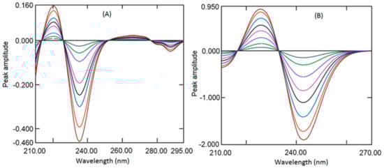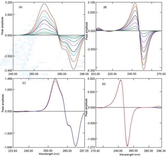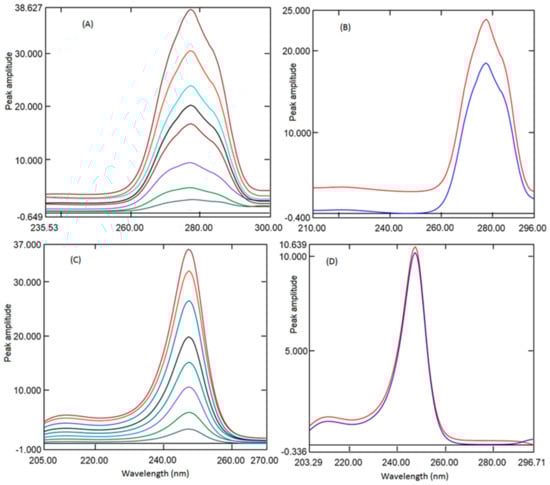 Therefore, the above-generated spectra were transmuted to first-order derivative ratio spectra utilizing divider wavelength of 4 nm. Diverse wavelengths between 1 and 8 nm were envisaged as ∆λ; the spectra generated with 4 nm exhibited better sensitivity, indicating why 4 nm was used. The first-order derivative spectra generated for REM displayed one positive peak at 267.2 nm and two negative peaks at −280.0 and −288.4 nm. (Figure 5A) However, at all wavelengths, amplitude was good, but at −288.4, percentage recovery and linearity were better; hence, −288.4 nm was selected for further study. The first derivative spectra of MET presented one maximum at 243.0 nm and one minimum at −251.7 nm (Figure 5B). The peak amplitude was good at both wavelengths; however, good recovery and good sensitivity were observed at 251.7 nm; hence, 251.7 nm was utilized for construction of linearity curve. Ratio of first-order derivative spectra generated from the mixture (REM and MET) and a pure standard (REM Or MET) were compared in Figure 5C,D. The amplitudes showed by analyte were found to be the same in the mixture and pure analyte spectra consisting of the same amount of analytes.