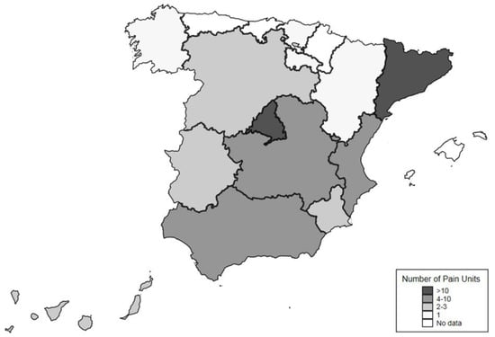 Sixty-nine pain units (Figure 1) from 13 autonomous communities (regions) agreed to participate and were included in the analyses (please see Figure 2). Following the IASP guidelines, 38 pain units were classified as modality-oriented clinics (i.e., healthcare facilities that offered a specific type of pain treatment but did not provide comprehensive assessment or management); 19 as pain clinics (i.e., facilities which offered pain treatment and comprehensive assessment and management, but were not multidisciplinary); and 12 as multidisciplinary pain centers (i.e., facilities with a variety of care providers capable of assessing and treating physical, psychosocial, medical, vocational and social aspects of chronic pain). Response rate was 38%.