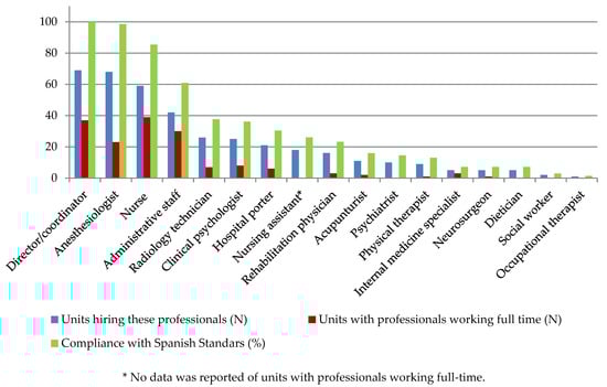 Staff composition can be found in Figure 3. There was a median (IQR) of 10 (7–14) professionals working at each unit, six (4–9) of whom were not full-time employees. Along with anesthesiologists (present in 98.6% of the pain units), nurses (85.5%) and administrative staff (60.9%) were the most common professionals working in the units. This table shows also the level of compliance of those criteria with the Spanish Standards.