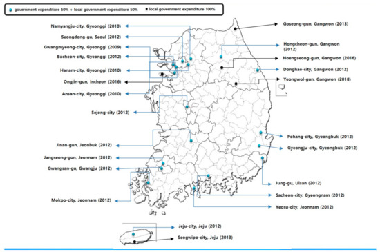 Recognizing this, after establishing a comprehensive plan for cardio-cerebrovascular diseases in 2006, the Ministry of Health and Welfare chose Daegu Metropolitan City as the pilot region to register and manage hypertension and diabetes patients through local clinics and pharmacies in 2007 in order to establish the management for hypertension and diabetes not only as an individual approach, but also as a community-centered management system. This chronic disease management intervention (Korea Hypertension Diabetes Daegu Initiative, KHyDDI) first began four years ago in a rural area. It is foremost now within the main framework of CCM [20,21]. Afterwards, registration and education centers for hypertension and diabetes in 2012 were expanded to 19 districts of 12 Metropolitan cities and Provinces [22] with budgets allocated from central and local government as shown in Figure 1. Unlike the central government’s original plan, however, these community-based intervention programs are currently only operated in 9.8% of the country, with additional participation from some local governments [23,24].