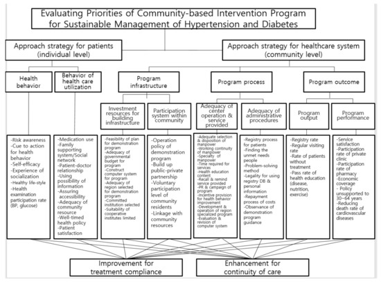 First of all, this study is the first attempt to assess priorities at the level of patient’s individual and healthcare system of community-based intervention programs for sustainable management of chronic diseases. Management of chronic diseases is not just a problem in developed countries today [2,3]. Chronic diseases are directly related to aging due to their characteristics, but they are also largely related to how each patient usually maintains health-related behaviors before the age of 60 [12,13,14]. To date, diverse interventions have been applied along with various theoretical models to solve this problem at national or community level in both developed and developing countries. Korea is currently trying to quickly respond to policy suggestions through implementation and expansion of community-based intervention programs in the primary care setting in a national level [19,21,22,23,24,28,29]. It is important not only to find hidden hypertension and diabetes patients within the community, but also to find patients who do not continue treatment early [10]. The optimal implementation strategy of community-based intervention program for sustainable management of hypertension and diabetes depends on the presence of such an evaluation mechanism. This study developed an evaluation model to find the best alternative for sustaining the continuous management of hypertension and diabetes using the AHP as the most promising method for prioritizing requirements as China’s case [58]. In this study, results of AHP modeling were divided into the evaluation of criteria and relative priorities of decision alternatives of community-based intervention for sustainable management of chronic diseases.