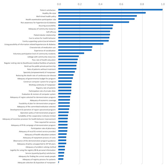 Priority of the third evaluation sub-criteria for community-based intervention program with pairwise comparison. To easily interpret priorities (global weights), the critical factor (patient satisfaction) with the highest priority was standardized to one. Other factors were rearranged according to their importance ranking.