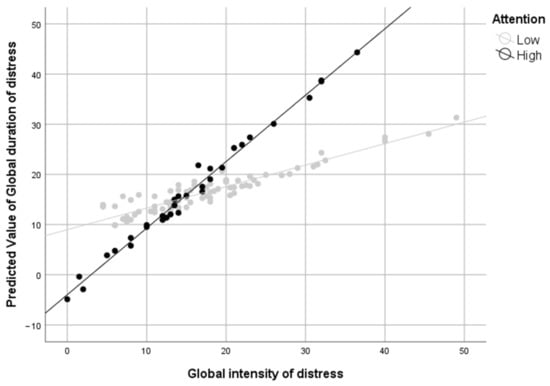 However, our results do support Hypothesis 2b, as there is a statistically significant moderation of attention and GID. The effect size (see Table 1) of this moderation indicates that the relationship between GID and GDD varies depending on attention, so that for every unit of increase in intensity of distress, the duration of distress increases between 0.1 and 1.6 (95% CI) units more when there is high attention than when there is not. This moderation effect is depicted in Figure 1.