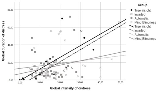 Focusing on these groups, hypothesis 3 predicted that the True Insight group would be more associated with a reduced time of distress compared to the Mind-Blinded group, and even more clearly compared to the Invaded group.