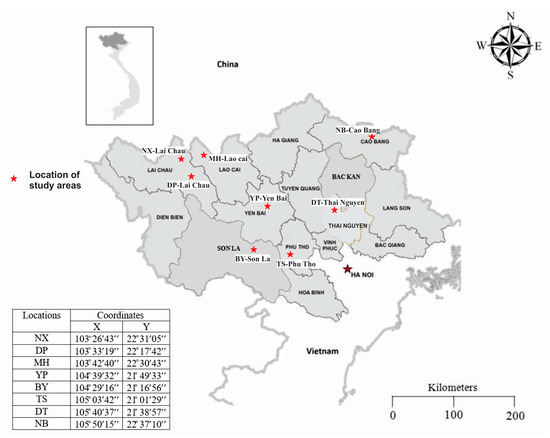 The eight areas in Northern Vietnam, including NX-Lai Chau, DP-Lai Chau, MH-Lao Cai, BY-Son La, TS-Phu Tho, YP-Yen Bai, DT-Thai Nguyen and NB-Cao Bang were selected for this study. The location of these areas is presented in Figure 1. The NX mine is one of the largest rare earth element (REE) mines in Vietnam, with probable reserves of about 7.7 million tons. DP mine ranks the second, with probable reserves of about 3.7 million tons and is followed by MH with approximately 400,000 tons and YP with about 5000 tons [17]. BY (Son La), TS (Phu Tho) and NB (Cao Bang) have uranium ore deposits, while DT (Thai Nguyen) is the largest polymetallic mine in Vietnam.
