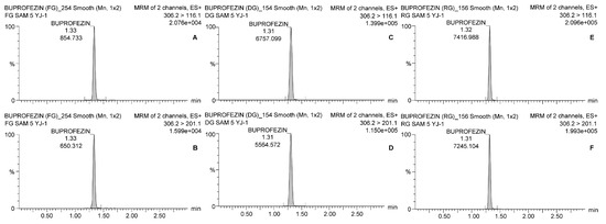 Chromatograms of buprofezin analysis with LC-MS/MS. The quantitation and confirmation ions were detected with 306.2 > 116.1 and 306.2 > 201.1, respectively. (A) Quantitation ion and (B) confirmation ion for fresh ginseng; (C) quantitation ion and (D) confirmation ion for dried ginseng; (E) quantitation ion and (F) confirmation ion for red ginseng.