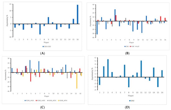 Being asymmetric during movement is common since the human body is also asymmetric from an anatomic and neurological point-of-view [1]. The predominance of one limb over the other is usual in many sports, and for that reason, asymmetries between limbs are commonly seen in different sports [2,3,4]. Actually, in some cases, being asymmetric seems to play an important role for performance, in particular, in elite sports [5]. Therefore, a given level of asymmetry may be considered functional. However, there is a natural threshold in which the asymmetry may lead to an increase in risk for each player [6]. Possibly, this threshold is individual for each player and it is important to consider meaningful variations of this in intra-individual analysis [7].