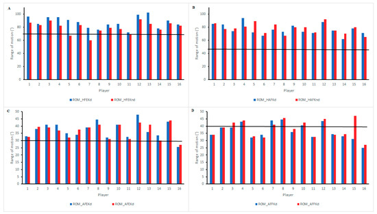 Figure 2 reports individual ROM values for each player and the associated injury risk. In ROM_HFEK, two players presented ROM values related to high injury risk in their non-dominant leg, in ROM_HAFK all players presented ROM values related to high injury risk, in ROM_AFEK one player presented ROM values related to high injury risk in both dominant and non-dominant legs, and in ROM_AFFK eleven players presented ROM values related to high injury risk in their dominant leg and nine in their non-dominant leg.