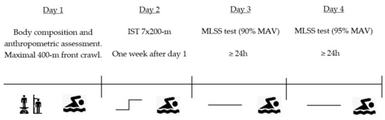 Athletes performed a total of four visits to the water training facility within a 10-day period. On the first visit, all athletes provided written consent to participate in this study, as well as performed an anthropometric and body composition evaluation. Afterwards, the athletes performed a maximal 400-m front crawl (T400) in order to use the average velocity between 50 and the 350 m as an estimate of the maximal aerobic velocity (MAV) [27]. After one week, swimmers performed the IST. In days 3 and 4, the continuous swimming velocity MLSS tests (CT) were completed, first at 90% of MAV and in day 4 at 95% of MAV. Figure 1 illustrates the experimental protocol.