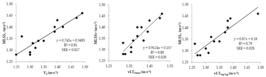 Linear regression of MLSSv on V4, vLTlog-log, and vLTDmax with standard error of estimate (SEE).