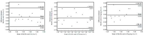The agreement between MLSSv and V4 is shown in Figure 3. The 95% limits of agreement (Loa) ranged from −0.059 to 0.066. Although the bias was 0.004 and there was no relation between the difference and the mean of the parameters there were somewhat wide limits of agreement (±5.1%). The bias between MLSSv and vLTlog-log was −0.016 and the Loa ranged between −0.039 and 0.072, representing a variation of ±4.1% of MLSSv. There was not a significant trend between the difference and the mean of the two measures. The MLSSv was overestimated by the vLTDmax with a bias of −0.038 with somewhat wide Loa ranging between −0.092 and 0.017, representing a variation of ±4.1% of MLSSv. There was not a significant trend between the difference and the mean of the two measures.