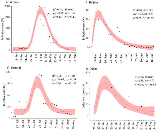 The fitting effect of the lognormal distribution model to the infected cases was better in Wuhan (R2 = 0.89, p-value < 0.001) and Beijing (R2 = 0.89, p-value < 0.001) than in Dalian (R2 = 0.86, p-value < 0.001) and Urumqi (R2 = 0.78, p-value < 0.001). This indicated that the fitting accuracy of the lognormal distribution model on COVID-19 infected cases varied among cities. Dalziel et al. [41] and Soebiyanto et al. [42] considered that the fitting accuracy of the pandemic model may be related to virus transmission pattern. Differences in population size and mobility, environmental condition, the quality and quantity of public medical resource, the initial infectious cases and genetic type of virus all affected the variation of COVID-19 spread [23,35,38]. Thus, the transmission pattern would be varied among different cities [35]. This result also can be proven by the difference in model fitting parameters among the four cities. Our result found that the fitting parameters (i.e., y0, xc, w and A) of the lognormal distribution model on COVID-19 infected cases all varied, indicating that the transmission pattern of COVID-19 changed among the four cities (Figure 2).