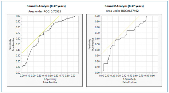 Results from Round 1 analysis revealed that although a few variables, including age, insurance, and socioeconomic risk emerged as statistically significant in the contingency table analysis (Table 3), only age was statistically significant in the logistic regression model, after adjusting for all other variables. The Chi-squared goodness-of-fit test was 25.94068 (df = 14) with p-value = 0.0263 indicating that the overall logistic regression model is significant. In addition, the area under the Receiver Operating Characteristic (ROC) curve was 0.7053 (greater than 0.50), confirming that the logistic regression model is adequate for this analysis. Figure 1 shows the ROC curves corresponding to logistic regression models for Round 1 and Round 2 analyses. As indicated in Table 4 (in the odds ratio section), children 5–9 years of age, were three times more likely than children under <5 years of age to have “repeat” ED visits (i.e., visit the ED more than once over an 18-month period). Other than age, no variable, including asthma severity, was significant in predicting “repeat” visits to the ED.