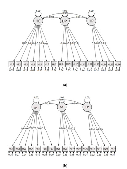 Measurement model and factor loadings for the Indian versions of the European Health Literacy Survey Questionnaire (HLS-EU-Q)16. (a) Hindi version (chi square (X2) = 123.884, df = 101, root mean square error of approximation (RMSEA) = 0.06). (b) Kannada version (chi square = 212.822, df = 101, RMSEA = 0.07). HC: Health Care; DP: Disease Prevention; HP: Health Promotion; HL1–16: Health Literacy measurement variable