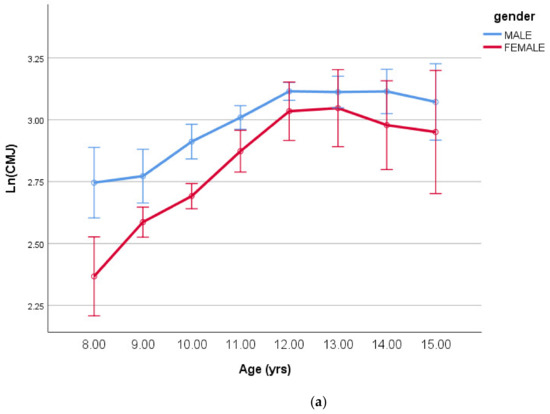 The sex and age group main effects together with their interaction varied significantly for log-transformed CMJ test (p < 0.001, p = 0.002, and 0.008, respectively). For the log-transformed SJ test, significant differences were identified for the age and sex main effects (p < 0.001), but there was no significant interaction effect (p > 0.05). The lack of the age-by-sex interaction can be explained better by the sex-by-MO and sex-by-MO2 interactions reported in Table 4 and plotted in Figure 3.