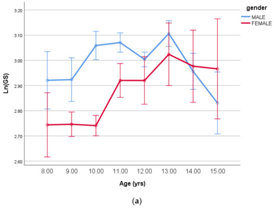 The constant “a” varied significantly for the log-transformed SLJ with the main effects of sex and age plus their interaction (all p < 0.001). For the log-transformed 5JT, significant differences were identified for the age and sex main effects (p < 0.001) but their interaction (p = 0.049). These interactions are shown in Figure 2a,b, respectively, below.
