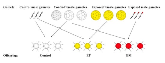 To further obtain the fertilized eggs, the fertilization procedure was performed based on the method of our previous studies [,]. Briefly, 20 μL of sperm were diluted into 50 mL of filtered seawater by a 0.45 μM filter and were then slightly added into 550 mL of an egg suspension solution. To assess the maternal and paternal effects, we set three independent embryo populations with each possible parental cross for different treatments: control female gametes fertilized by control male gametes (Control), exposed female gametes fertilized by control male gametes (EF) and control female gametes fertilized by exposed male gametes (EM) (Figure 1). The fertilized eggs were cultured at 16 ± 0.5 °C for 48 hpf (pluteus stage). The malformation effects were observed and recorded using an inverted microscope (OLYMPUS IX73, Japan). Normal larvae were detected as larvae meeting the following morphological criteria: (1) reached the four-arm pluteus stage developmental endpoint; (2) showed a left/right and abdominally symmetrical body; (3) displayed an excellent differentiated gut at 48 hpf; and (4) showed full skeletal rods and developed arms at 48 hpf. The malformed larvae included abnormal larvae and delayed larvae.