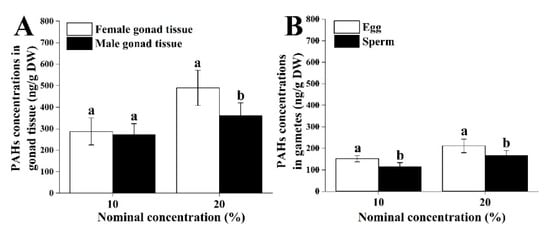 The concentrations of polycyclic aromatic hydrocarbons (PAHs) accumulated in (A) gonad tissues and (B) gametes from sea urchin females and males exposed to HFO WAFs for seven days. Data were presented as means ± SD. Lowercase letters indicate significant differences between sexes (p < 0.05). DW stands for dry weight.