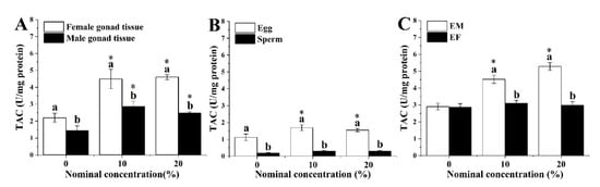 TAC in gonadal tissue, gametes and larvae of tissues samples was measured by using a total antioxidant capacity assay kit (Nan Jing Jian Cheng Bioengineering Institute, Nanjing, China) based on the colorimetric technique, as described by a previous study []. Briefly, the antioxidation substance was used to reduce ferric ion (Fe3+) to ferrous ion (Fe2+). Fe2+ was combined with phenanthrene to form stable complexes, which were measured at 520 nm by ultraviolet spectrometry. The sample was calculated for its antioxidant capacity via the absorbance value and was expressed as U/mg protein.