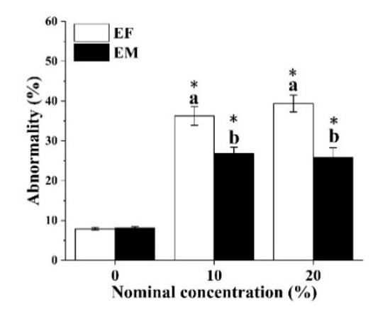 After being exposed to medium and higher concentrations, larvae derived from parental exposure showed a significantly increased (EF: 36.27 ± 2.35% at 10% and 39.35 ± 1.63% at 20%. EM: 26.8 ± 1.63% at 10% and 25.89 ± 2.43% at 20%) abnormality level in relation to the control (EF was 7.52 ± 0.32%, and EM was 8.05 ± 0.37%). Larvae derived from maternal exposure to HFO WAFs (10% and 20%) exhibited a significantly higher abnormality than those derived from paternal exposure (Figure 5).