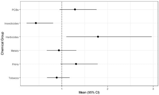 To analyze the association of exposure to the 49 chemicals and childhood leukemia, we placed the chemicals into the following six chemical groups: PCBs, PAHs, insecticides, herbicides, metals, and the tobacco exposure markers of nicotine and cotinine. These groupings were based on structural similarity (e.g., PCBs, PAH) or their use (herbicides, insecticides). We placed the fungicide ortho-phenylphenol in the herbicide group. For the analysis, we estimated the exposure effect for each of the six groups simultaneously for childhood leukemia using GWQS regression. In addition to modeling groups of environmental chemical exposures, we adjusted for the following covariates: child’s age, sex, ethnicity, annual household income, mother’s education level, mother’s age at birth of child, at whether the child lived at the sampling residence since birth. In fitting the GWQS model, we used four quantiles with 100 bootstraps and a 50–50 split of training and validation datasets We summarized the results using ORs for each group along with 95% confidence intervals and forest plots. We also assessed the important chemical exposures in the group using the estimated weights.