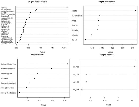 The estimated weights for the chemicals in significant or marginally significant groups from the GWQS model are shows in Figure 2. Amongst the herbicides, dacthal is the important chemical with a weight of 0.313. Among the marginally significant groups of PCBs and PAHs, PCB 138 and PAH indeno-123cd-pyrene are the most important chemicals, with weights of nearly 0.521 and 0.263, respectively. For insecticides, the most important chemical was carbaryl, albeit with an inverse association with leukemia.