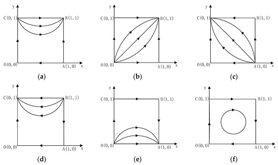 Situation 6: , and . Table 4 and Figure 1f display the two-dimensional coordinate graphs of the relationship between the two game parties and the evolutionary path. Under situation 6, there is no ESS, and the evolutionary path appears as a closed-loop.