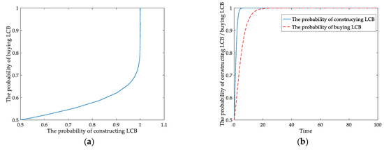 Situation 1: , and . Figure 1a displays the evolutionary process of developers and homebuyers’ behavior strategies. Table 4 and Figure 1a show that (1,1) is the ESS of the game; (Construct LCB, Buy LCB) is the ESS of the game between developers and homebuyers.