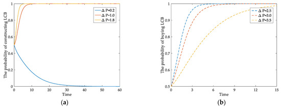 Table 4 and Figure 1 show that under the situation of , and , all the ESS are (Construct LCB, Buy LCB). It is an ideal state. Increasing the subsidies, the carbon tax, the external environmental benefits of LCBs and consumers’ awareness of the LCB concepts, and decreasing the cost of low-carbon technologies will have a positive impact on the low-carbon behavioral choices of developers and consumers. The players will actively make the decisions to choose LCBs when they obtain sufficiently high additional benefits from LCBs. In situations 3 and 4, for both and , provided that is satisfied, (Construct CB, Buy LCB) is the ESS. This result means that regardless of whether consumers are interested in LCBs, developers always choose to build ordinary houses. However, based on the above assumption, once developers construct CBs, homebuyers have to buy them. For this situation, it can be understood that LCBs have not yet been accepted and fully recognized by most developers in the real world.