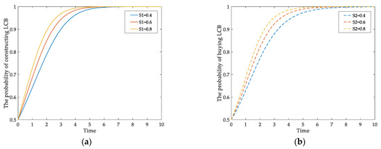 Figure 4a,b respectively show the influence of government subsidy incentives on the behaviors of developers and homebuyers. When the parameters S1 and S2 change from 0.4 to 0.8, the behavioral probabilities of both players tend to 1 from the initial 0.5. From the simulation results, it can be seen that the time when the probabilities of the two players reach 1 is different. The probability of the developers is one at t = 6, and the consumers’ is at t = 8. The comparison shows that the government’s incentives to market entities can speed up their choices of LCBs and the effects of subsidies on them are different.