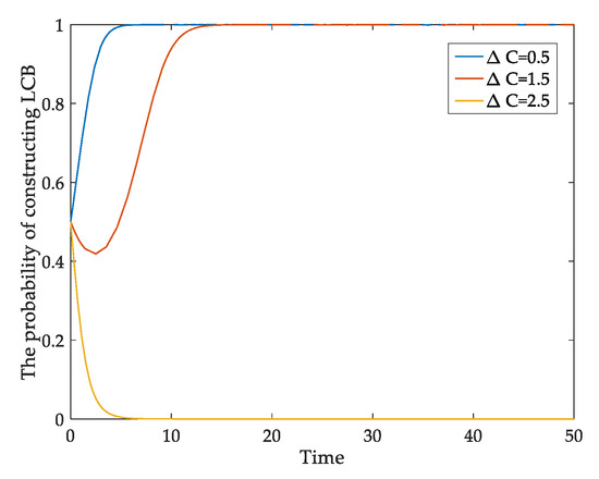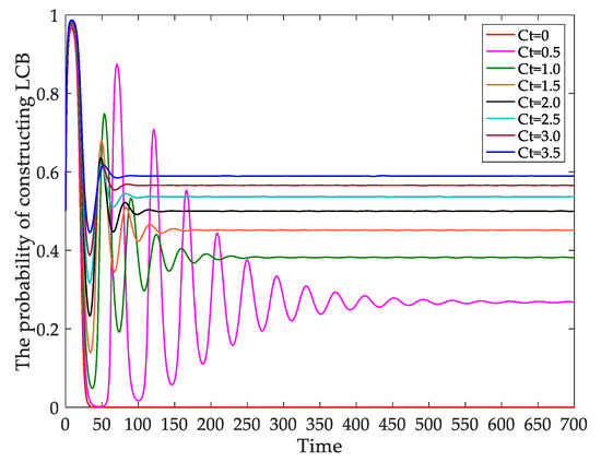 In the beginning stage, the behaviors of developers fluctuate, and the fluctuation in amplitude gradually decreases over time. Eventually, the evolutionary paths of developers tend to be stable. With the increase in Ct, the restriction on developers constructing CBs is working. The probability of developers choosing LCBs increases, and the time to stability is faster. However, when the carbon tax rate is raised to a certain level, the increasingly smaller time difference over the probability tending to be stable can be determined, and the increase in the probability becomes lower.