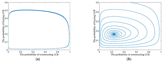Situation 2: , and . Table 4 and Figure 1b also show that (1,1) is the ESS of the game in condition 2, which means that (Construct LCB, Buy LCB) is the ESS.
