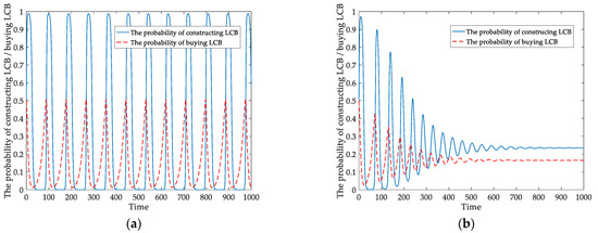 When the income relationship satisfies , , the results are shown in Figure 2a,b. As the iteration process proceeds, the probabilities of developers constructing LCBs and homebuyers buying LCBs increase. When the sum of subsidy and environmental benefit is higher than the incremental price of LCB, the interests of homebuyers are guaranteed, and they are willing to buy LCBs. When the net income of LCBs (), government subsidy and tax are positive, the developers have enough revenue incentives to build LCBs. Finally, their ESS is (Construct LCB, Buy LCB). The system evolves from (0.5, 0.5) towards the stable equilibrium point (1, 1).