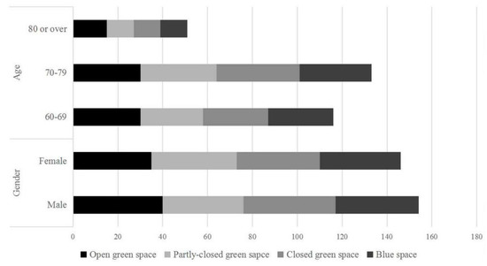 A total of 300 respondents were included in the study. The results showed that the number of male and female participants was relatively equal (51% were male, 49% were female), and most of the participants were aged around 60–79 (83%). The participants were evenly distributed in the four types of the selected environments (Figure 2).