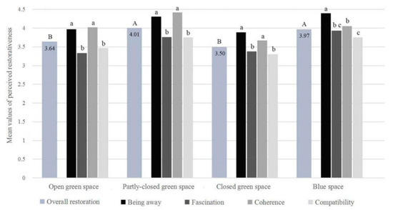 ANOVA with post hoc tests on differences in perceived restorativeness among the four study sites (Significant differences in overall restoration at the 0.05 level is shown by different letters A and B; significant differences in the four restorative components at the 0.05 level is shown by different letters a, b and c).