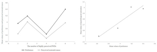 3.4. Relationship between the Number of Highly Perceived PSDs, Preference and Psychological Restoration