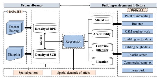 In this study, we use a comparative framework to explore the effects of built environmental factors on urban vibrancy. As shown in Figure 2, first, we choose two urban vibrancy metrics and build an index system of the built environment from four aspects based on multisource big data. Second, the spatial distribution patterns of RPD-derived vibrancy and SCB-derived vibrancy are investigated based on kernel density estimation (KDE). Because the original data is discontinuous point data, KDE could help us understand the overall spatial characteristics of urban vibrancy in the study area by resampling the data to a continuous smooth surface. Finally, we model the relationship between associated factors and urban vibrancy with geographical weighted regression (GWR) while exploring the significantly associated factors and mapping the spatial dynamics of their effects on urban vibrancy.
