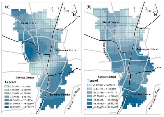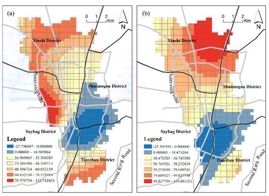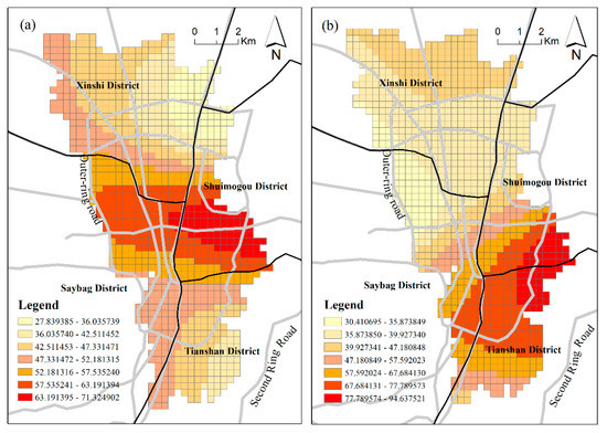 Spatial patterns of urban vibrancy in Urumqi: (a) RPD derived vibrancy; (b) SCB derived vibrancy.