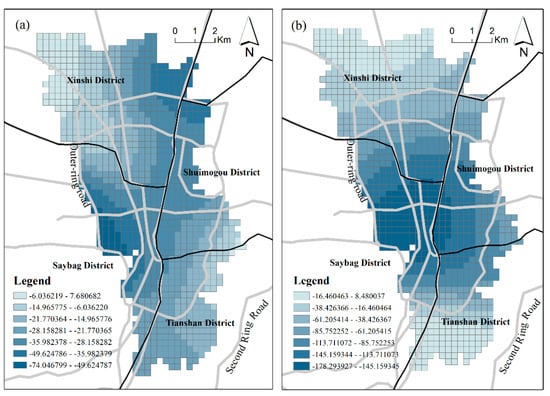 The different results of the regression coefficients show that the influence degree and action trend of each built environment factor are different in different grids. The results of the two models clearly indicate that the spatial effect of the nine influencing factors shows significant spatial differentiation. In the two models, the influence of FAR on the possessive grid is positive. All Den_busstop effects are positive in model 2. There are positive and negative differences in the effects of the other factors, from which we can draw some interesting conclusions. The median coefficients of MU, ABH in model 1, and Den_busstop in model 2 are positive numbers, meaning that these factors can stimulate vibrancy in most instances. The rest of the variables have a negative median, which means that these factors have a more negative effect on Urumqi urban vibrancy. In model 2, the influence of the built environment factors has greater spatial differentiation because the standard deviation of the coefficient is larger in model 2 than in model 1.