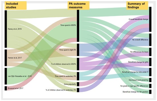 - Brink, L.A.; Nigg, C.R.; Lampe, S.M.R.; Kingston, B.A.; Mootz, A.L.; Van Vliet, W. Influence of schoolyard renovations on children’s physical activity: The learning landscapes program. Am. J. Public Health 2010, 100, 1672–1678. [Google Scholar] [CrossRef]