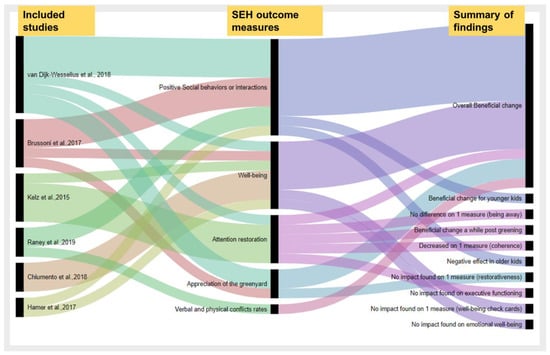 | Chiumento et al. (2018) [45] North West England Kids experiencing behavioral, emotional and social difficulties. | Design: Mixed-methods pre–post evaluation design. Sample size (n = 36) School children aged 9–15 years. Data Source: The Mental Wellbeing Impact Assessment (MWIA) qualitative tool and the and the 7-item Warwick-Edinburgh Mental Well-being Scale were administered pre–post intervention. | Independent variable Exposure to the Social and Therapeutic Horticulture (STH) green space intervention. Outcome Mental well-being Measure with the Mental Well Being Impact Assessment (MWIA) and Wellbeing Check Cards | Qualitative analysis used for the MWIA results Quantitative analysis used to compare Scores from the Wellbeing check cards pre- and post-intervention | Group based socially interactive horticulture activities facilitated by trained therapists are associated with positive impacts upon the mental and emotional well-being of children experiencing behavioral, emotional and social difficulties. Wellbeing check cards had worse scores in many domains post intervention, no results seemed to be statistically significant. | Limitations: The study was a pilot and had a small sample size |