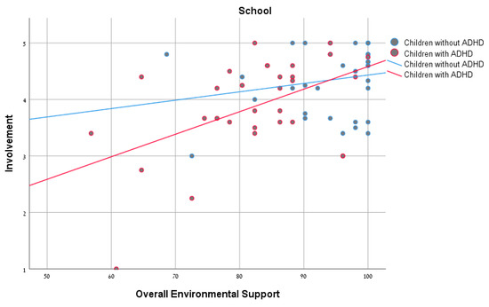 Correlations between overall environmental support and involvement among children with and without ADHD in the school environment.