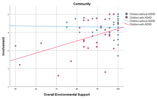 Correlations between overall environmental support and involvement among children with and without ADHD in the community environment.