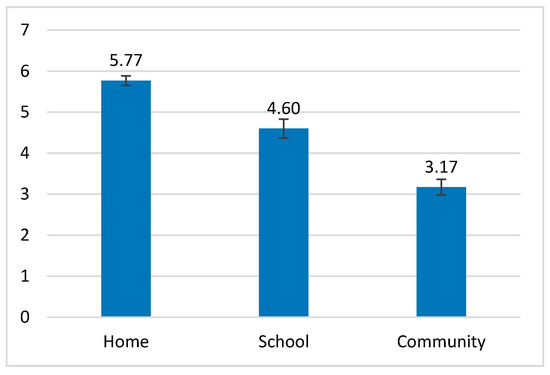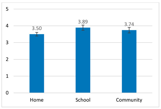 Involvement in participation also significantly changed with the settings as follows: F(2, 60) = 3.943, p = 0.025, partial η2 = 0.12. In pairwise comparisons with Bonferroni correction, the mean of involvement at home was significantly lower than in school (p < 0.05), but no significant differences were found when comparing the involvement at home and school to the involvement in the community (Figure 5).
