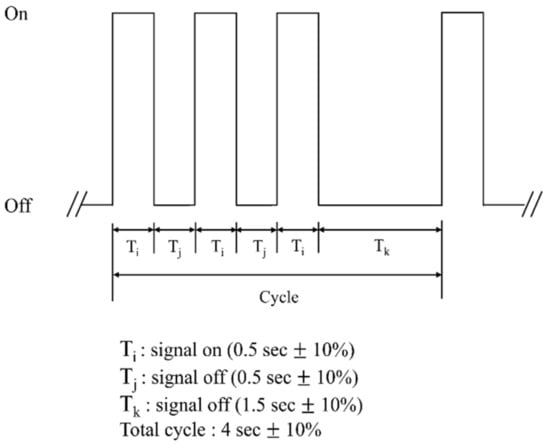 The temporal three (T-3) pattern is recommended by the International Organization for Standardization (ISO) as an international fire alarm sound [6]. Additionally, this pattern is suggested by the United States National Fire Protection Association 72 (1996) [7] and The National Building Code of Canada (1995) [8]. To be specific, the T-3 pattern consists of signaling on/off for three repetitions of 0.5 s, and then the signal is off after being maintained for 1.5 s (please see Figure 1). Such a regular T-3 pattern is noticeable in background noise, and thus can minimize the masking effect from the fire alarm [9]. However, this pattern has a flaw in being commonly applied to any kind of sound because of the existence of only a time-domain without acoustically specific features. Furthermore, the frequency range of the T-3 pattern is different in manufacturers [10,11], which warrants further study to determine a scientific and evidence-based fire alarm [11]. On the other hand, a bell has often been used as a fire alarm for public buildings in Korea and Canada, and a slow whoop is mainly used in buildings in the U.S. [9]. The slow whoop proposed by Gosswiller [12] is defined as a square wave tone with a frequency range of 500 to 700 Hz. It is characterized by being gradually increased by one octave for 2.5 to 4 s at the base frequency and then is repeated after a brief pause of 0.3 to 0.5 s. Slightly differently, the slow whoop of Humphreys [13] gradually increases in frequency from 600 to 1100 Hz, with a short cycle of about 4 s. However, it also emphasizes intensity and/or signal-to-noise ratio while being used in a few standards of the U.S., U.K., and South Korea without considering the frequency-specified information.
